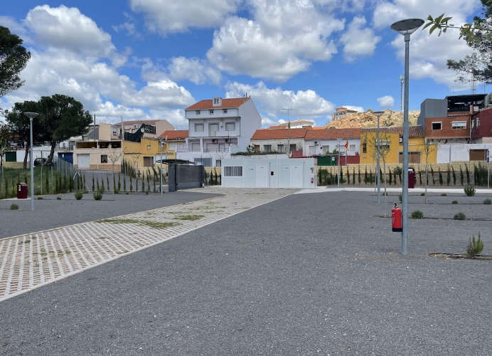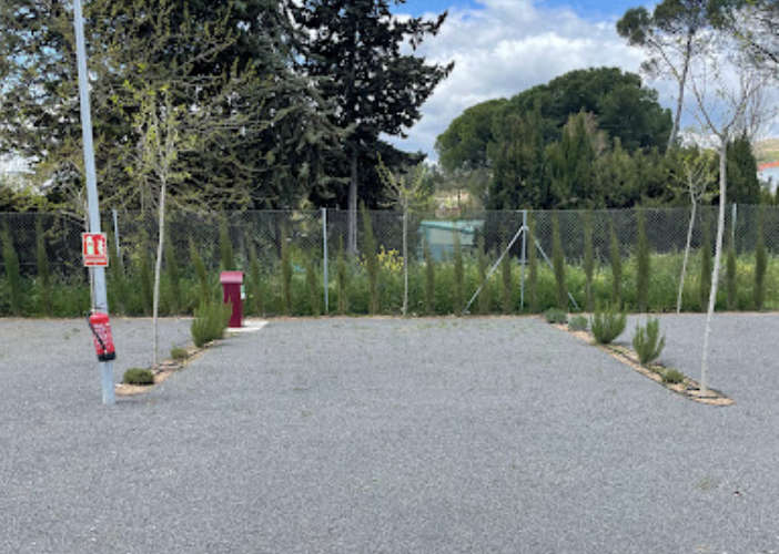 El área de autocaravanas de Almadén (Ciudad Real) se encuentra a 150 m de la carretera N-502, en un recinto vallado con suelo de zahorra bien nivelado sin sombras, amplias plazas delimitadas e iluminación nocturna, situado junto al Polideportivo y las Piscinas en una zona de fácil acceso tranquila para pernoctar, del extrarradio de la población.