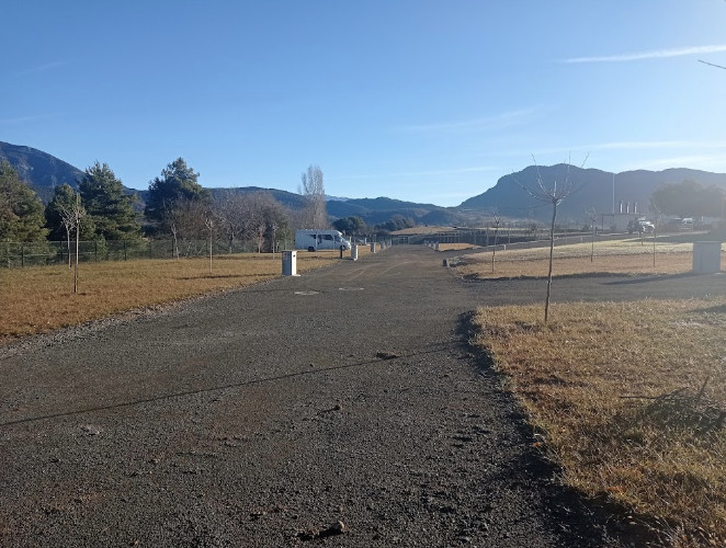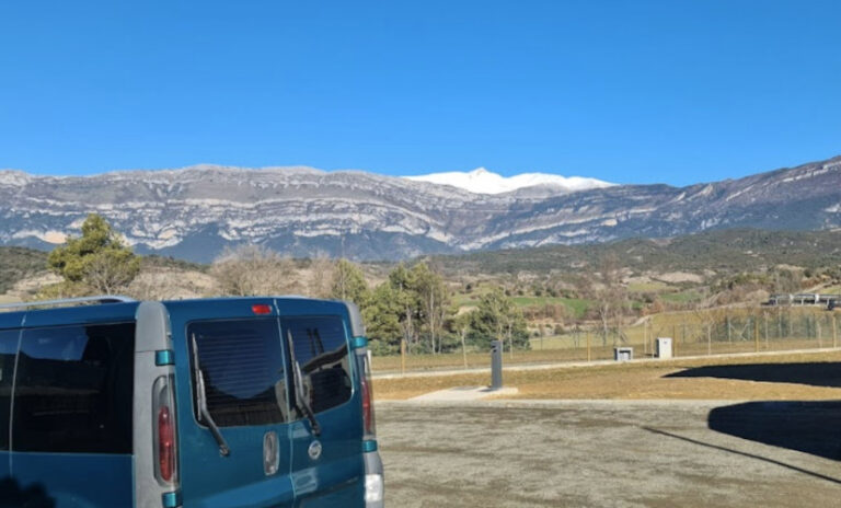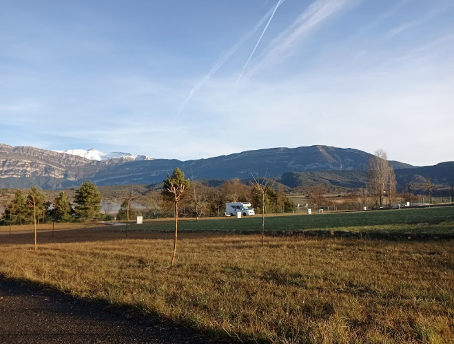 El área de autocaravanas Ecocamping Rural de Alueza (Huesca) se sitúa en pleno Valle de la Fueva, a 4 km de la carretera N-260, en un terreno llano rodeado de montañas, con amplias parcelas de césped, bien niveladas, sin sombra, situado en una zona rural muy tranquila para pernoctar.