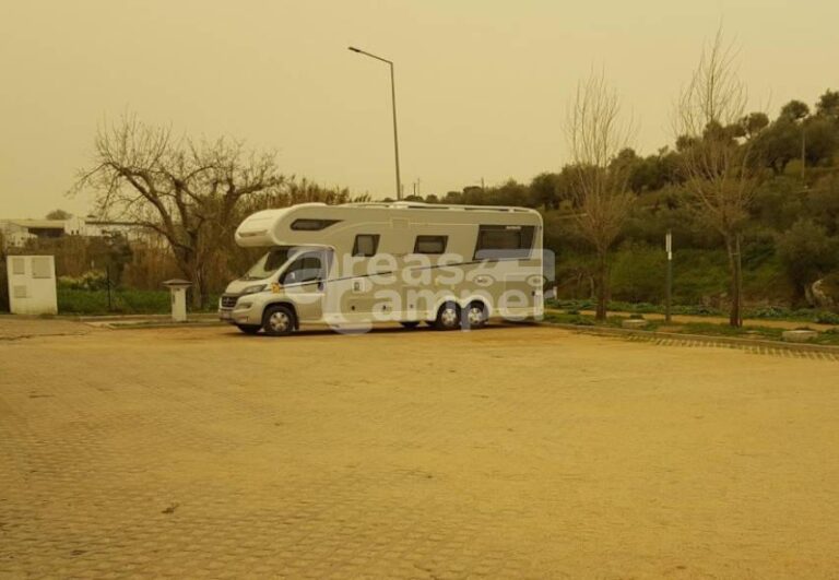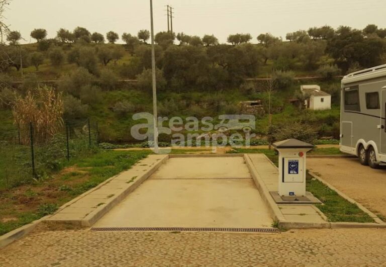 El área de autocaravanas de Arronches (Portugal) se encuentra a 1 km de la carretera N246, en un recinto embaldosado bien nivelado, con amplias plazas reservadas sin delimitar e iluminación nocturna, sin sombras, situado junto al Río Caía en una zona con bonitas vistas, tranquila para pernoctar, del extrarradio de la población.