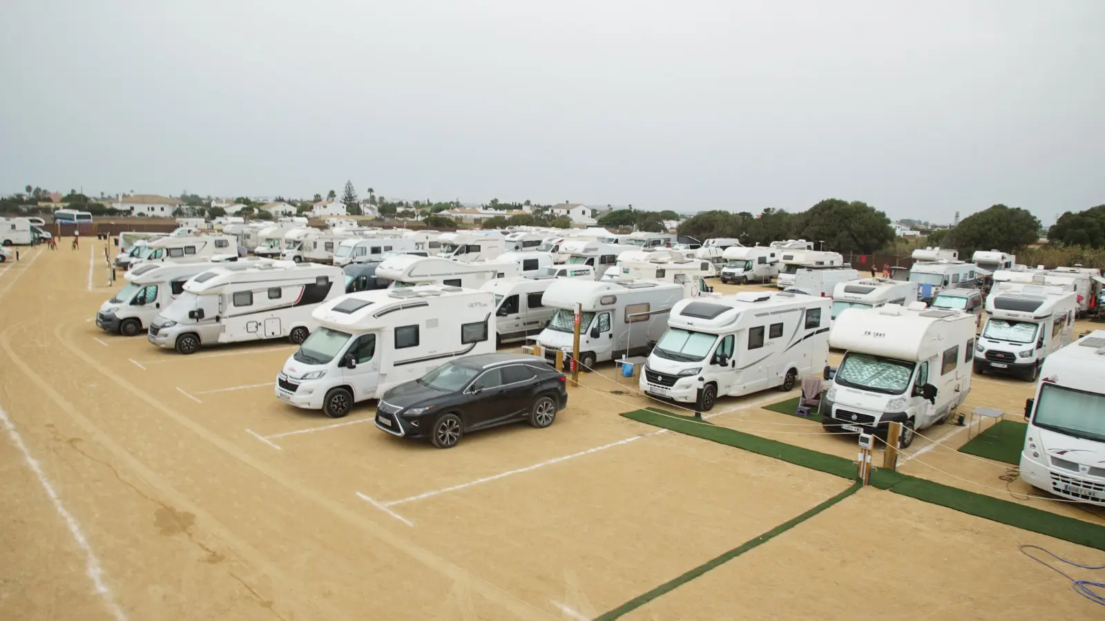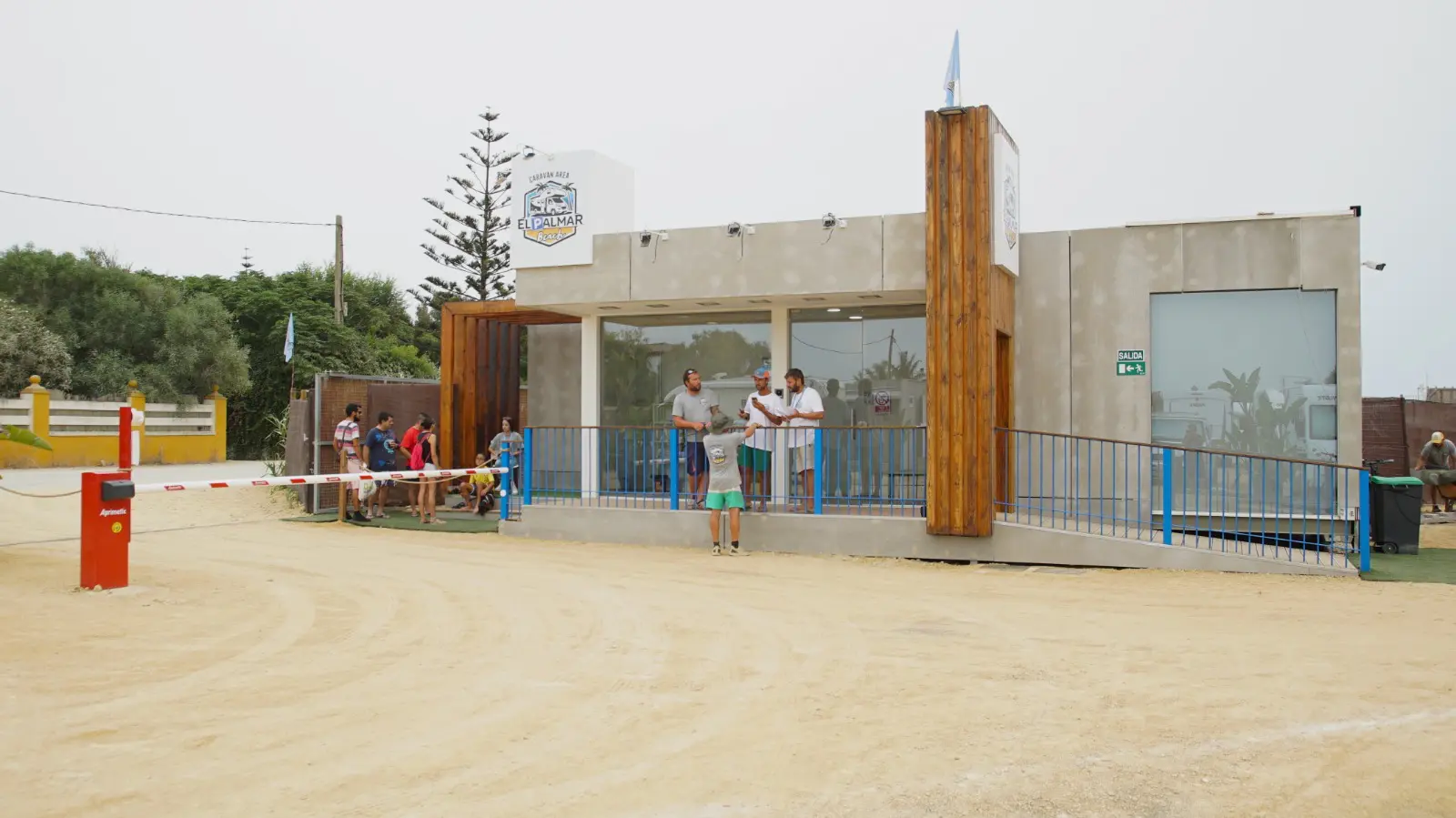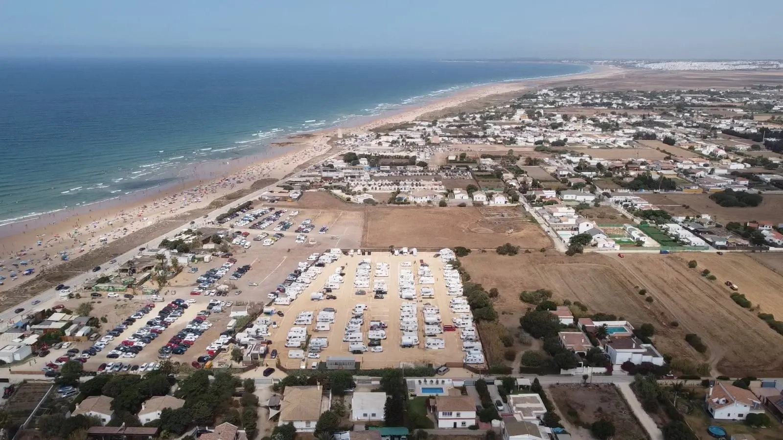 El área de autocaravanas de El Palmar Beach (El Palmar de Vejer, Cádiz) se encuentra a 1,5 km de la carretera CA-215, en un recinto privado verjado con suelo de tierra compactada bien nivelado, plazas reservadas delimitadas e iluminación nocturna, sin sombras, situado en una zona de fácil acceso, tranquila para pernoctar cerca de la playa.