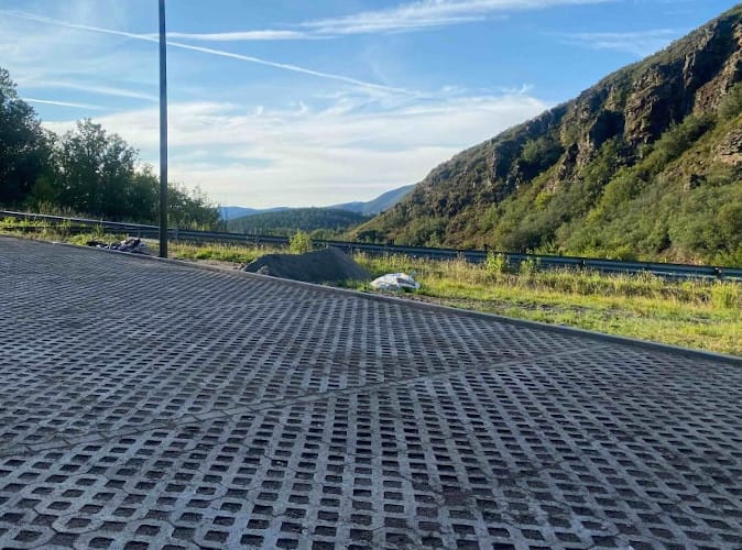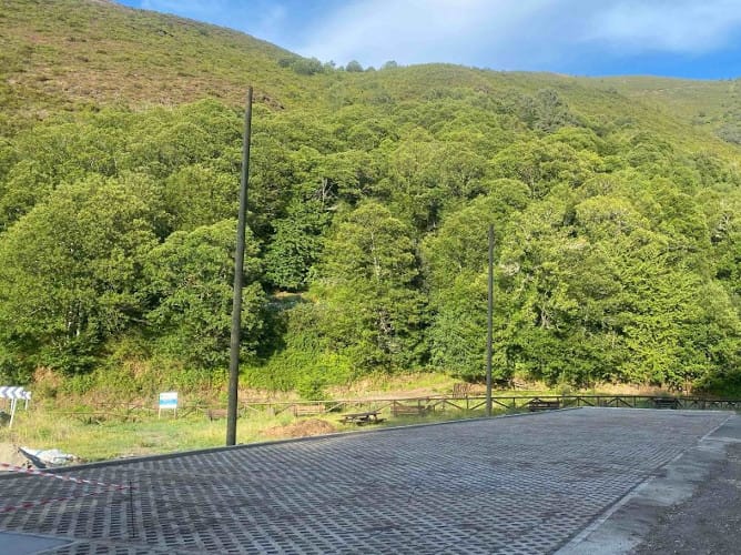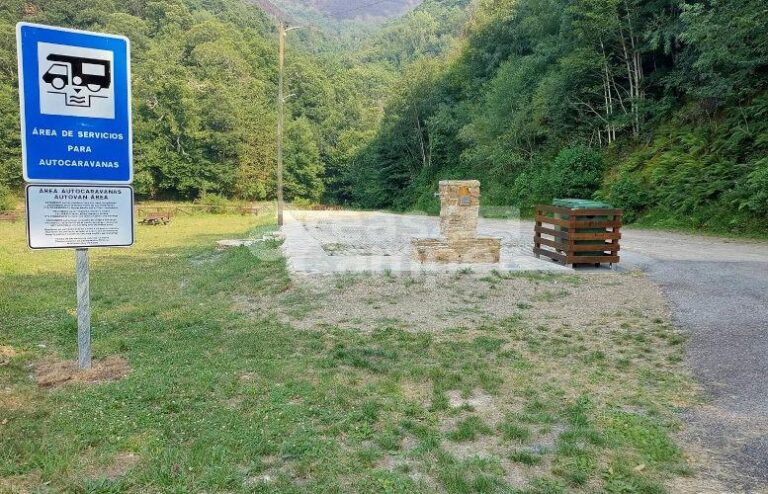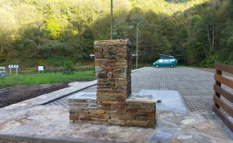 El área de autocaravanas de Folgoso do Courel (Lugo) está ubicada en la carretera LU-651, justo en una de las curvas, en un terreno embaldosado bien nivelado, con amplias plazas reservadas para autocaravanas e iluminación nocturna, sin sombras, situado en pleno bosque de castaños, muy cerca del pueblo de Santa Eufemia do Caurel.
