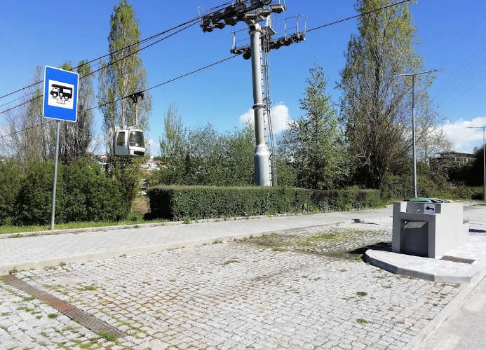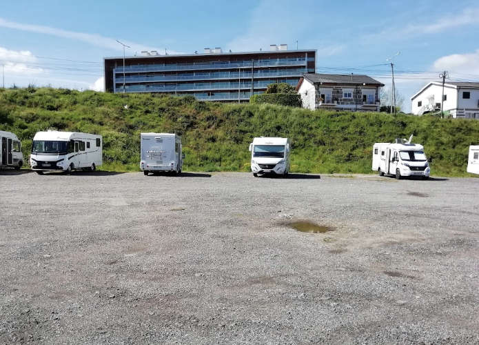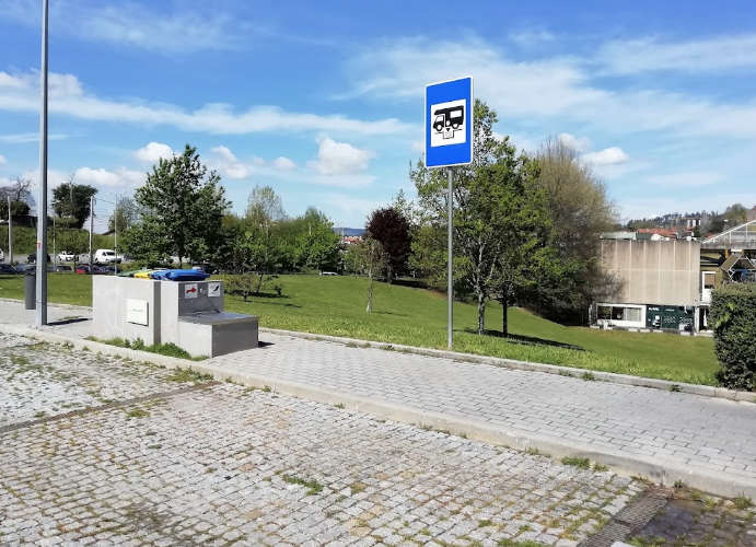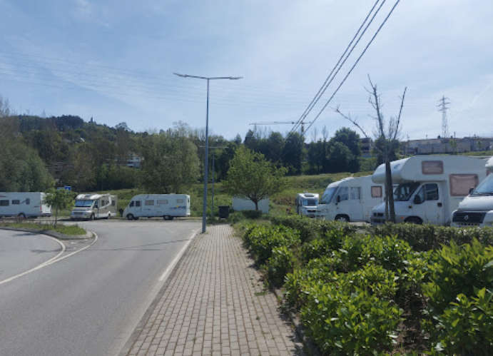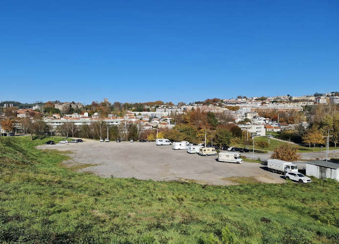 El área de autocaravanas de Guimarães (Braga, Portugal) se encuentra a 500 m de la carretera N101-2 y a 750 m de la N101, en un parking mixto con suelo de zahorra bien nivelado, sin plazas delimitadas ni sombras ni iluminación nocturna, situado en una zona de fácil acceso, tranquila para pernoctar, del extrarradio de la población.