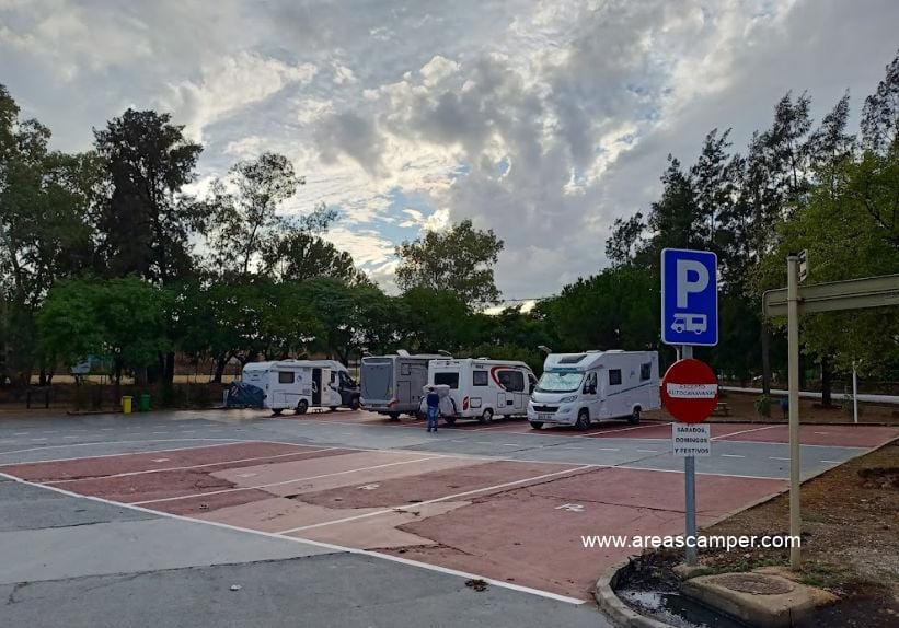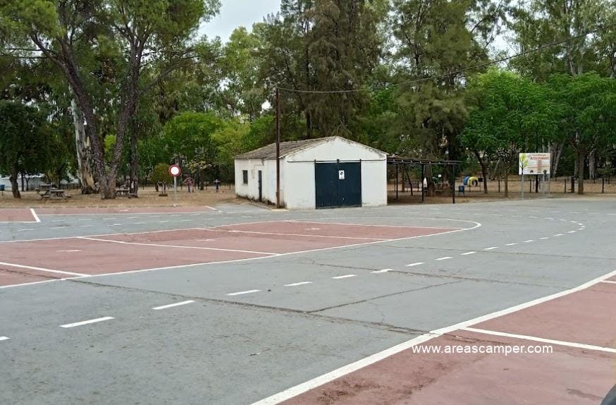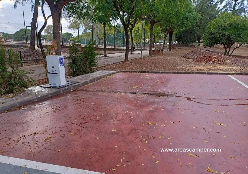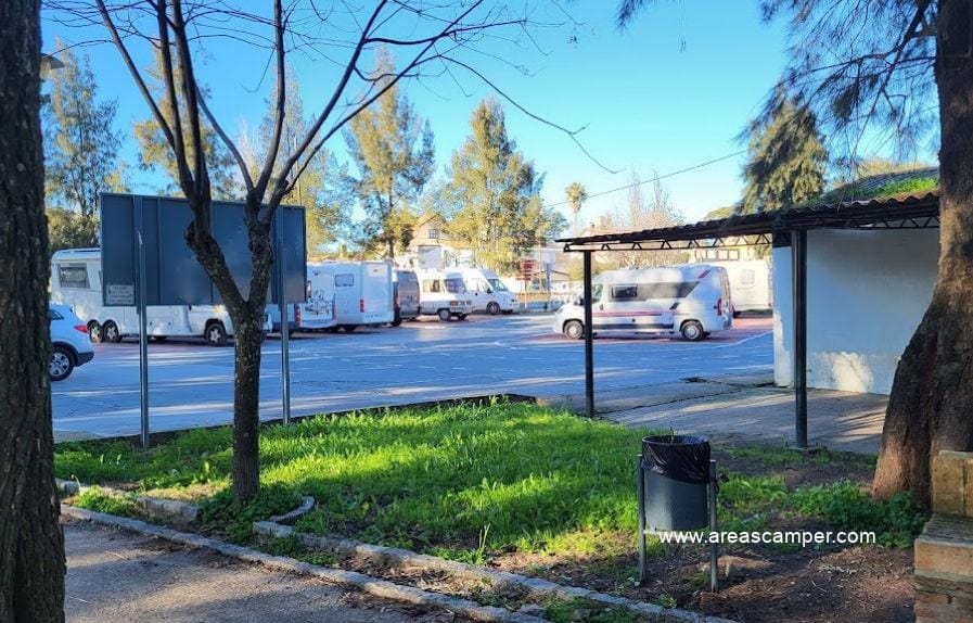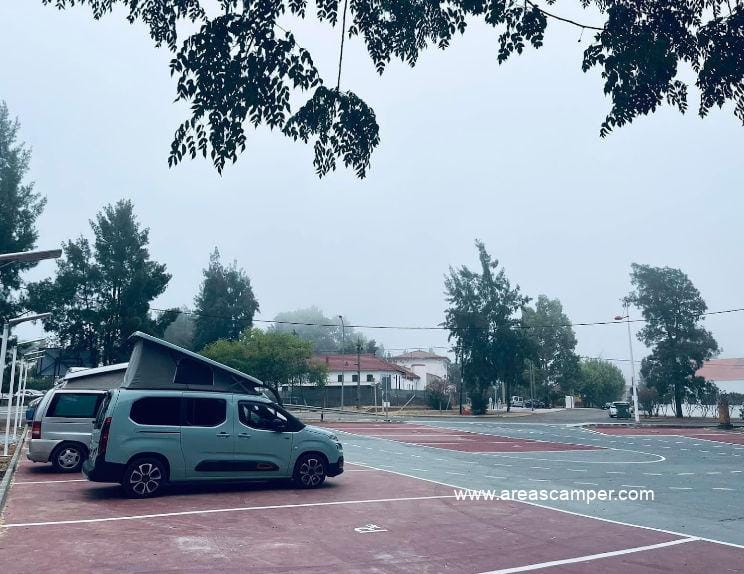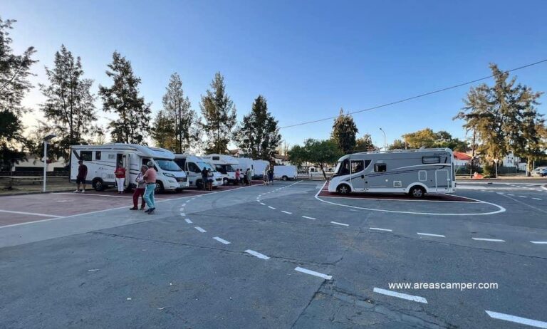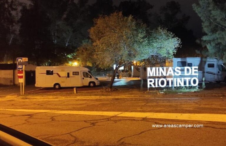 El área de autocaravanas de Minas de Riotinto (Huelva) se encuentra a 5 km de la carretera N-435, junto a la A-461, en un recinto con suelo de cemento bien nivelado, amplias plazas reservadas delimitadas, algunas sombras e iluminación nocturna, situado al lado del puesto de la Guardia Civil, en una zona de fácil acceso con pinos, tranquila para pernoctar, del extrarradio de la población.