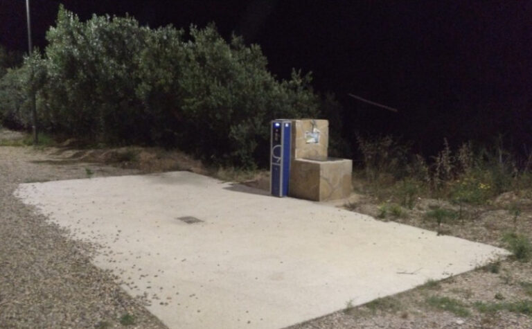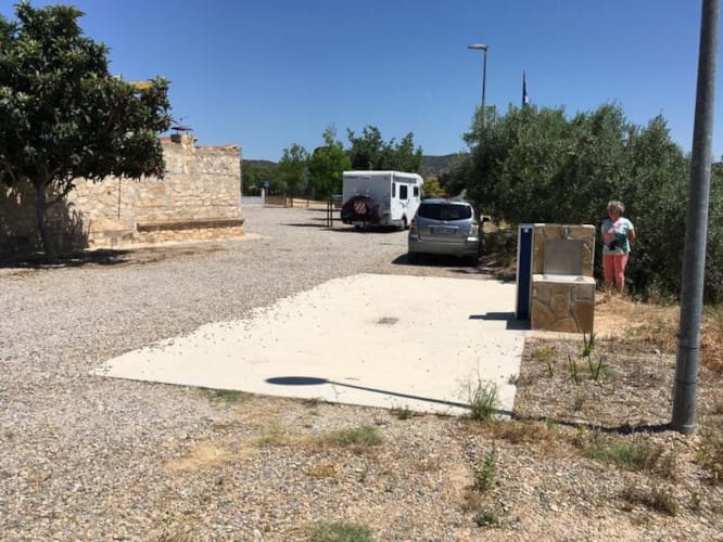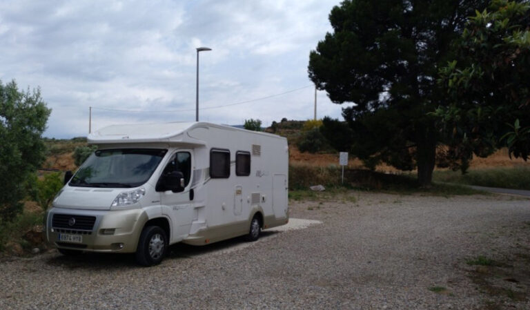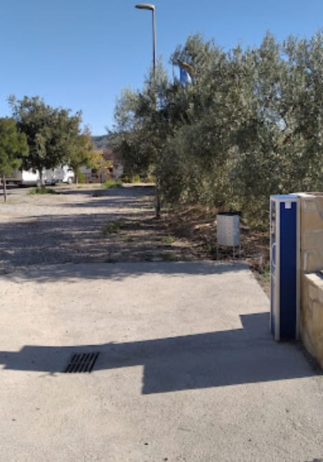 El área de autocaravanas de Riba-roja d’Ebre (Tarragona) se encuentra a 4 km de la carretera C-12, en un terreno de zahorra bien nivelado, sombras, sin iluminación nocturna, situado en una zona tranquila para pernoctar, del extrarradio de la población.