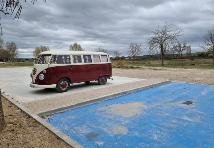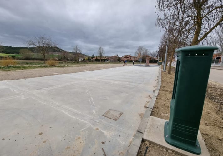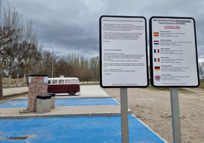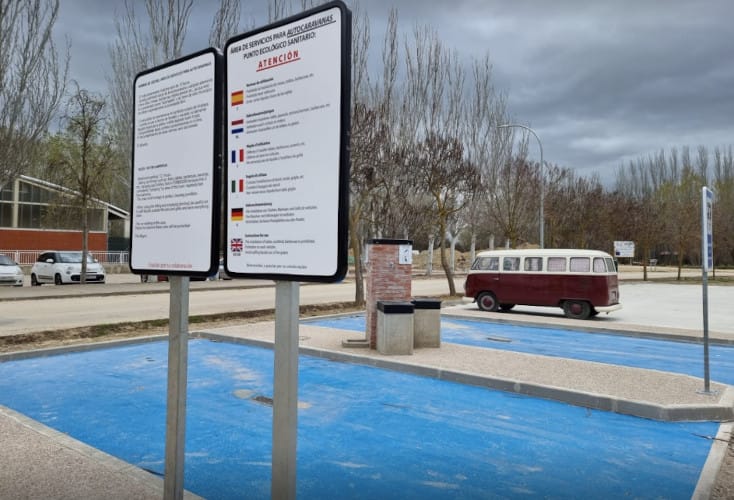 El área cámper cuenta con doble plataforma de servicios, dos columnas con 4 tomas de conexión eléctrica cada una y 7 plazas de aparcamiento para autocaravanas y caravanas, todas ellas con unas dimensiones de 4×8 m.