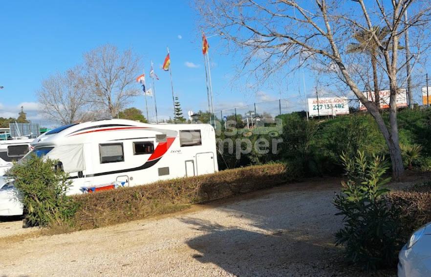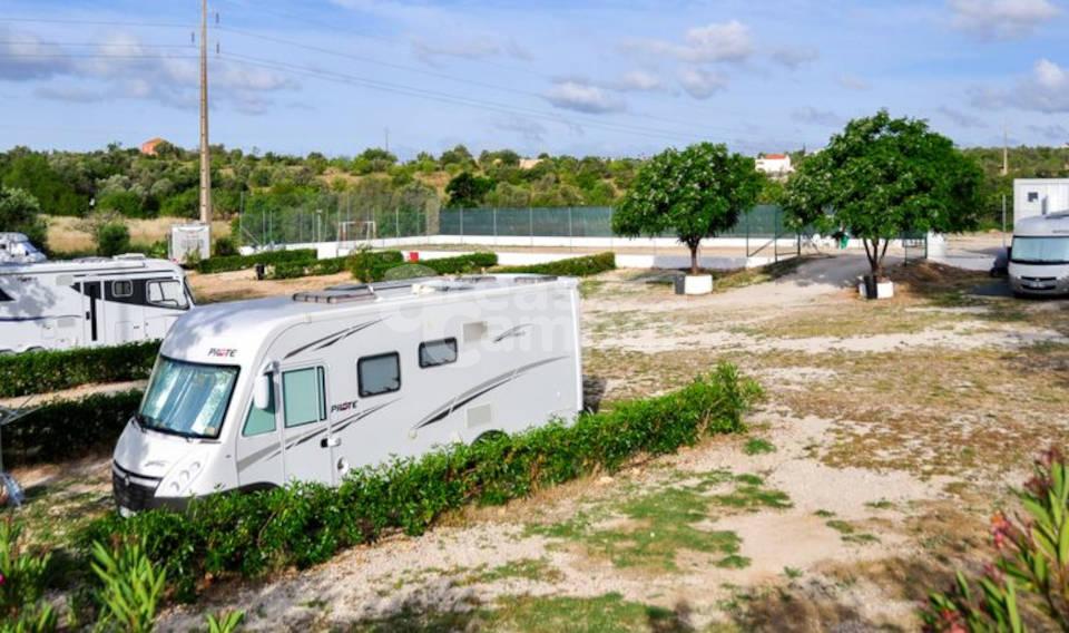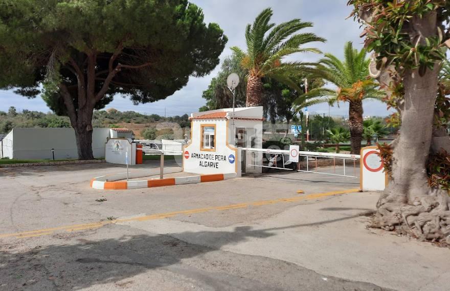 El área de autocaravanas de Camping Canelas en Armação de Pêra (Portugal) se encuentra a 900 m de la carretera N125, en un recinto privado verjado con suelo de zahorra bien nivelado, amplias plazas reservadas delimitadas, algunas sombras e iluminación nocturna, situado en una zona de fácil acceso, tranquila para pernoctar en un entorno rural.