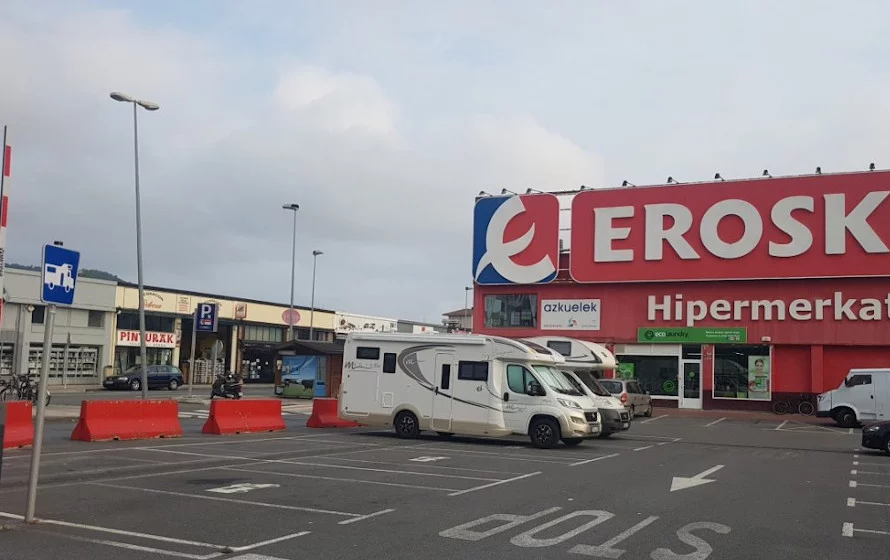 El área de autocaravanas en Zarautz (Gipuzkoa) se encuentra a 1 km de la salida 38 de la autovía AP-8 y a 900 m de la carretera N-634, en un terreno asfaltado bien nivelado, sin sombras, situado en el Centro Comercial Eroski, en el extrarradio de la población. No se puede pernoctar.