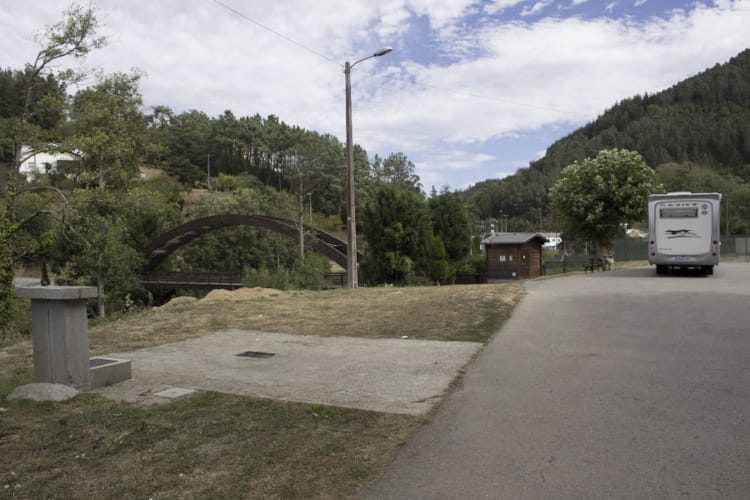 El área de autocaravanas de A Pontenova (Lugo) se encuentra a 200 m de la carretera N-640, en un parking asfaltado bien nivelado sin plazas delimitadas ni sombras, con iluminación nocturna, situado junto a las piscinas municipales y el Río Eo en una zona de fácil acceso con bonitas vistas, algo transitada y ruidosa durante el día, pero tranquila para pernoctar en el extrarradio de la población.