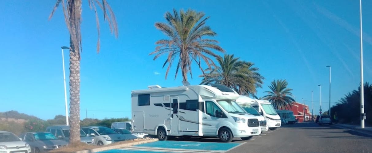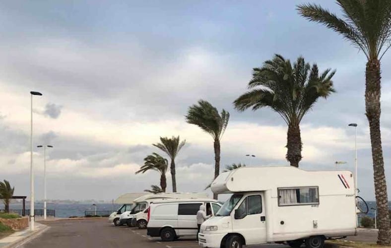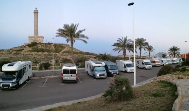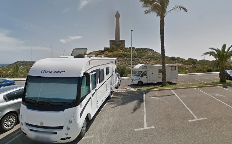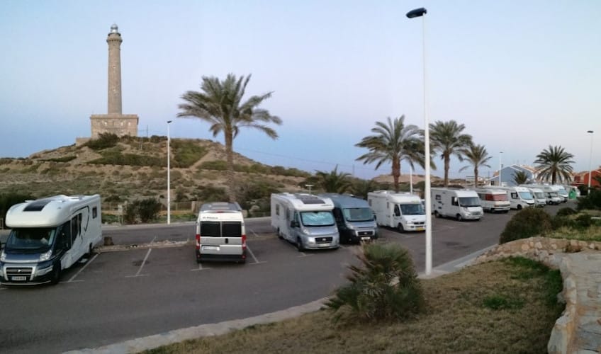 El parking pernocta de autocaravanas en Cabo de Palos (Murcia) está en primera línea de playa, en el verano está más complicado, pero en el invierno sin problemas de sitio.