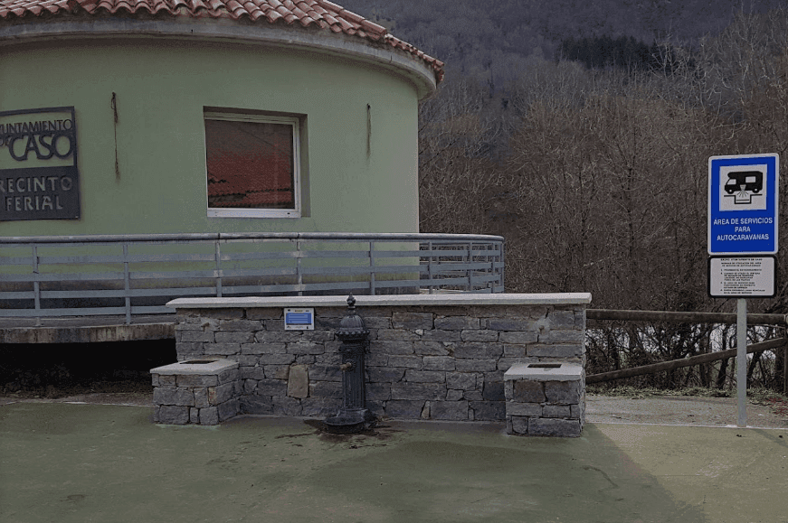 El área de autocaravanas de Campo de Caso (Asturias) se encuentra en el recinto ferial, en un terreno asfaltado, algo desnivelado, sin sombras, con iluminación nocturna, situado en una zona tranquila para pernoctar, del extrarradio de la población.