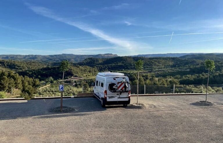 El área de autocaravanas de Masroig está en el parking que está enfrente de la Agrobotiga Celler Masroig, donde se pueden adquirir vinos, aceite y productos artesanos.