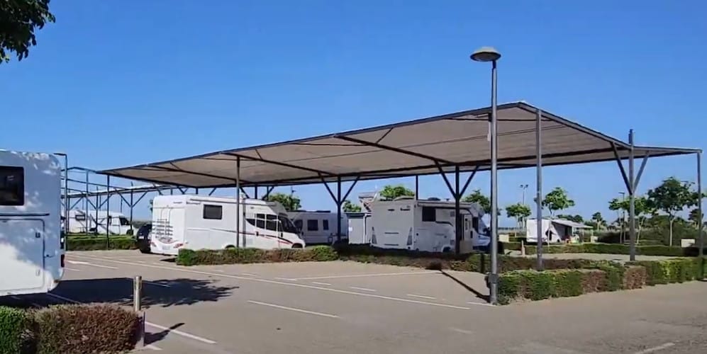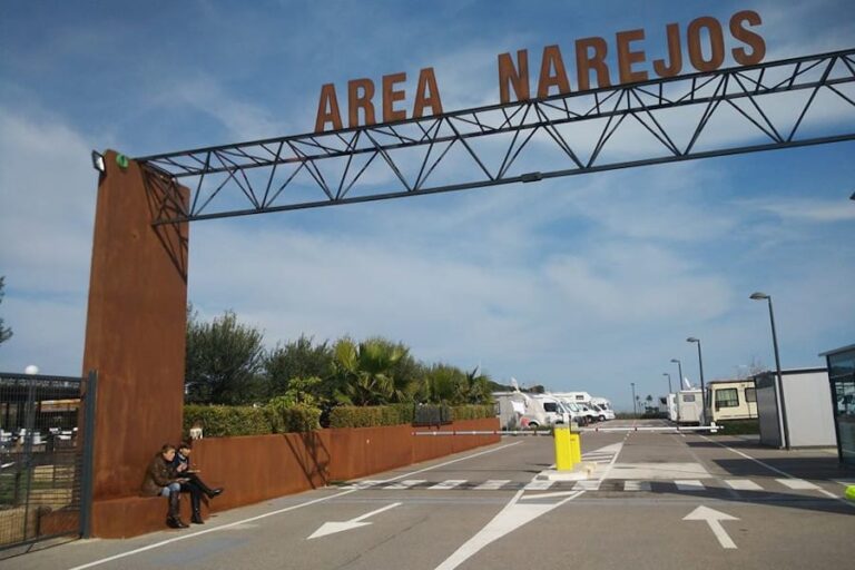 El área de autocaravanas Narejos de Los Alcázares (Murcia) se encuentra a 1,20 km de la carretera N-332, en un terreno asfaltado, bien nivelado, con sombras, con iluminación nocturna, parcelas delimitadas por setos, situado en una zona tranquila para pernoctar, del extrarradio de la población.
