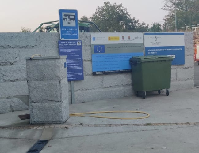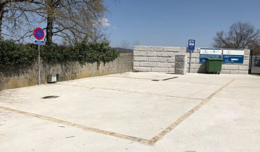 El área de autocaravanas de Mugueimes (Ourense) se encuentra a 15 km de la carretera OU-540, en un terreno asfaltado, bien nivelado, con sombras parciales, con iluminación nocturna, situado junto al Campo de Fútbol de O Muiños, en una zona tranquila para pernoctar, del extrarradio de la población.