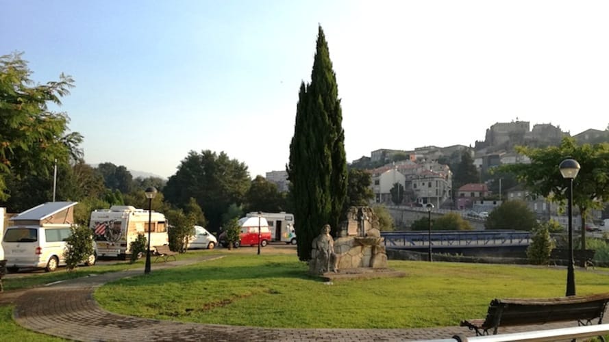 El área de autocaravanas de Tui (Pontevedra) se encuentra a 1,5 km de la autovía A-55 y a 30 m de la carretera N-550, en un recinto ajardinado junto al Ponte Tripes, con 3 plazas reservadas sobre suelo enlosado, algo desnivelado, sin sombras, con iluminación nocturna, situado en una zona algo ruidosa durante el día por su proximidad a la carretera, aunque tranquila para pernoctar, del extrarradio de la población, a la que se llega con facilidad, con bonitas vistas del pueblo de Tuy.